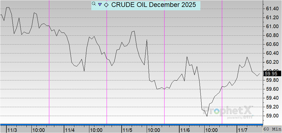 Crude prices opened the week at $61.40 on Monday and trended steadily lower as bearish supply sentiment weighed on markets. Prices slipped to $61.03 on Tuesday and $60.43 on Wednesday, marking midweek losses from rising global inventories and soft refining demand. The decline continued on Thursday, with crude opening at $59.68, before decreasing slightly to $59.65 on Friday. Overall, crude prices fell $1.75 per barrel, or 2.85%, for the week.
