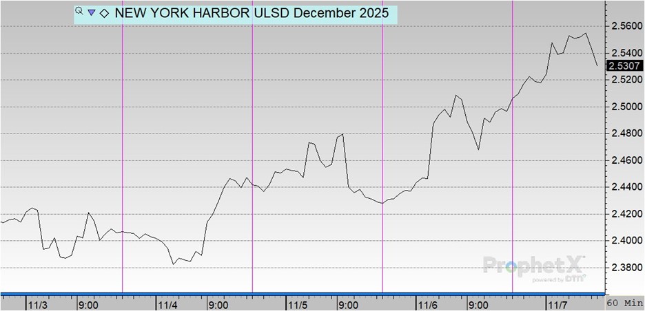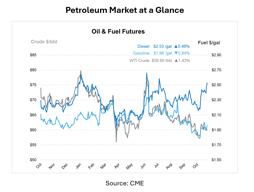 Rising global production, coupled with weakening U.S. refining activity, has pressured market sentiment. U.S. crude stocks posted a surprise 5.2 million barrel build, driven by higher imports and lower refinery utilization during the fall maintenance season. Gasoline and distillate inventories both fell, with distillate demand ticking up to 3.71 Mbpd. While headlines emphasize the bearish implications of continued crude builds, distillate stocks remain 4.25 million barrels below year-ago levels, leaving the market sensitive to colder weather or an unexpected refinery outage that could tighten supply and lift prices.