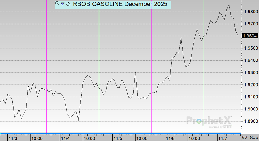 Gasoline prices experienced moderate gains this week, supported by regional refinery disruptions and stronger retail demand. The market opened at $1.9008 on Monday and inched higher through midweek, reaching $1.9213 on Wednesday before dipping slightly to $1.9132 on Thursday. By Friday, gasoline prices climbed to $1.9588, marking the week’s high. Overall, gasoline rose $0.0580 per gallon, or 3.05%, for the week.