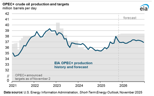 Part of that growth comes from OPEC+ production increases. The group began raising production targets in April 2025 and plans to maintain those levels through December. However, it announced a pause in new increases through March 2026 due to weaker seasonal demand. Even with that pause, the EIA forecasts OPEC+ output to average about 1.3 million b/d below its targets next year as the market becomes saturated.