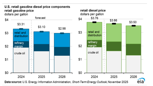 - Diesel: Retail diesel prices are expected to average $3.70/gal in 2025 and fall to $3.50/gal in 2026, roughly 7% lower than 2024.