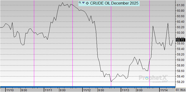 Crude prices opened the week at $59.87 on Monday and moved modestly higher on Tuesday to $60.07, followed by a stronger uptick on Wednesday when prices reached the weekly high of $61.05. Markets then pulled back sharply on Thursday, with crude dropping to $58.47, before increasing slightly on Friday at $58.71. Overall, crude fell $1.16 per barrel from Monday’s open, a 1.94% decrease week-over-week.