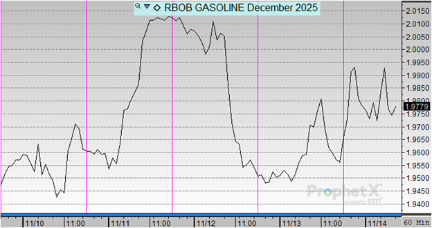 Gasoline prices opened at $1.9440 on Monday and edged higher to $1.9630 on Tuesday, before posting the week’s strongest gain on Wednesday at $2.0132. Prices then pulled back on Thursday to $1.9523, increasing slightly on Friday to $1.9605. Overall, gasoline rose $0.0165 per gallon from Monday’s open, marking a 0.85% increase week-over-week.