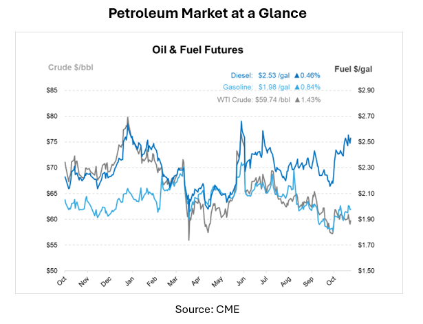 Crude markets were pulled in multiple directions this week as rising geopolitical risks overlapped with shifting U.S. fuel policy debates and early signs of supply improvement. Prices climbed more than 1% on Friday after a Ukrainian drone strike hit Russia’s Novorossiysk port, which is one of the country’s most important crude export hubs. This event led to a temporary cease in shipments and prompted pipeline operator Transneft to suspend its flows.