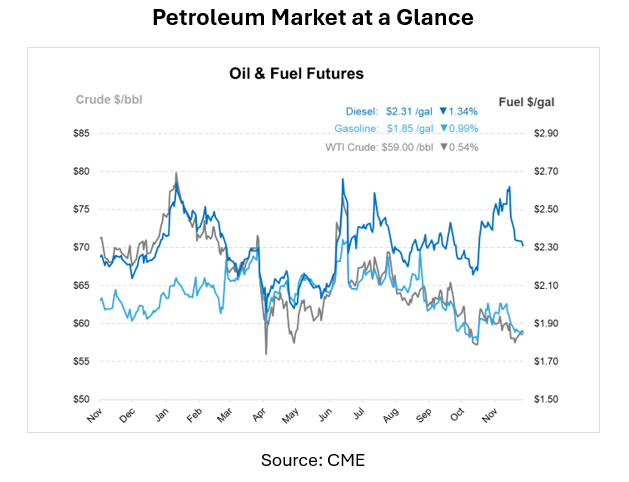 U.S. fuel markets are entering December with a rare stretch of lower prices, as both gasoline and diesel continue to fall. Crude benchmarks remain under pressure, and seasonal demand softness is providing some temporary cost relief to fleets. But beneath the recent declines lie important geopolitical and supply-side developments that could influence price trajectories heading into 2026.