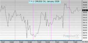 Crude prices opened the week at $58.96 on Monday and showed modest day-to-day movement. Prices edged higher to $59.52 on Tuesday before slipping to the weekly low of $58.65 on Wednesday. By Thursday, crude increased slightly to $59.09, and this morning opened at $59.70, the highest level of the week. Overall, crude increased by $0.74, marking a 1.26% gain week-over-week.