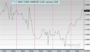 Diesel prices opened the week at $2.3198 on Monday and saw moderate fluctuations. Prices ticked up to $2.3441 on Tuesday, the weekly high, before retreating midweek. Wednesday brought the sharpest decline, with diesel falling to $2.3037, followed by a slight dip to the weekly low of $2.3015 on Thursday. This morning, diesel opened at $2.3221, essentially returning to Monday’s level. Overall, diesel increased by $0.0023, a 0.10% gain for the week.