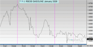 Gasoline prices opened at $1.8261 on Monday and rose on Tuesday, reaching the weekly high of $1.8708. Prices then eased midweek, falling to $1.8332 on Wednesday and edging slightly lower to $1.8268 on Thursday, marking the weekly low. This morning, gasoline opened at $1.8321, ending the week just above Monday’s starting point. Overall, gasoline increased by $0.0060, reflecting a 0.33% gain for the week.