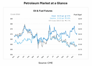U.S. fuel markets entered December with a mix of improving domestic supply, geopolitical uncertainty, and shifting macroeconomic expectations. Crude is ending the week with prices just shy of $60/bbl, while diesel is up 4 cents to $2.35 and gasoline is down 3 cents to $1.82. US markets are also anticipating a Fed rate cut at next week’s Federal Reserve meeting.