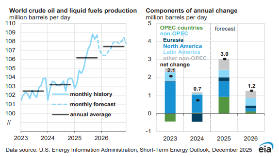 The December 2025 Short-Term Energy Outlook (STEO) reinforces the near-term bearish narrative. The EIA expects global oil inventories to continue rising through 2026, putting downward pressure on prices. Brent crude, which averaged about $64 per barrel in November, is forecast to fall to around $55 per barrel in the first quarter of 2026 and remain near that level for the rest of the year.