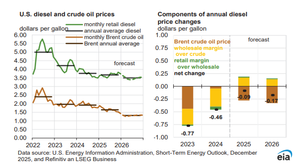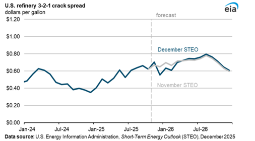 The STEO also highlights uncertainty around refinery margins. While crack spreads are expected to ease in early 2026, ongoing sanctions on Russia, refinery attacks, and shifting trade flows remain sources of upside risk for refined product prices, particularly diesel.