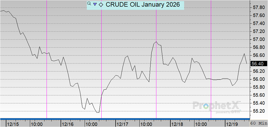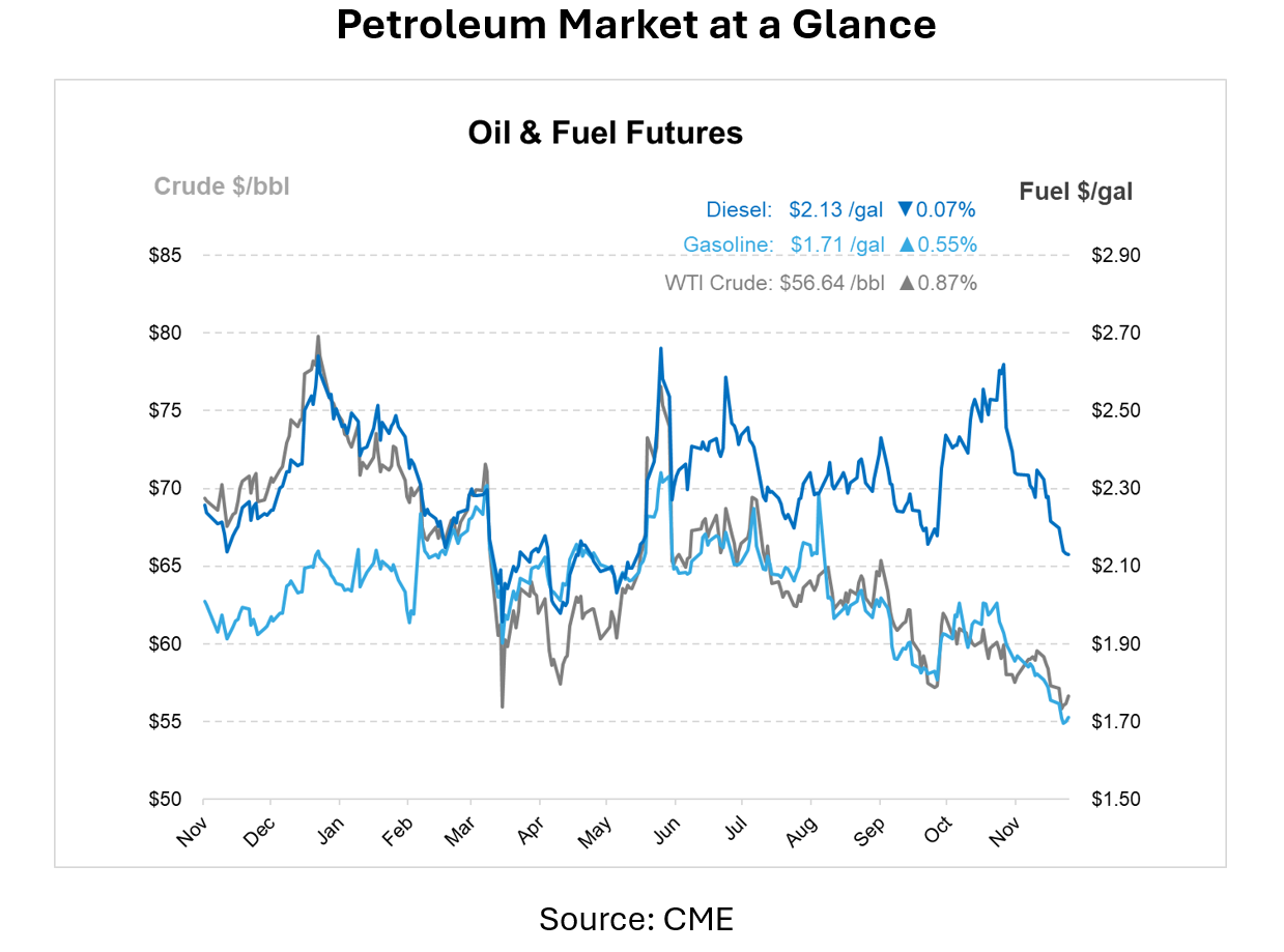 Petroleum markets are closing the week lower but are trading nearly 50 cents higher this morning ahead of the January 2026 NYMEX WTI contract expiry and lingering geopolitical uncertainty. However, these gains appear technical in nature rather than a shift in underlying fundamentals, and have done little to alter the broader downward trend that has defined much of the week.