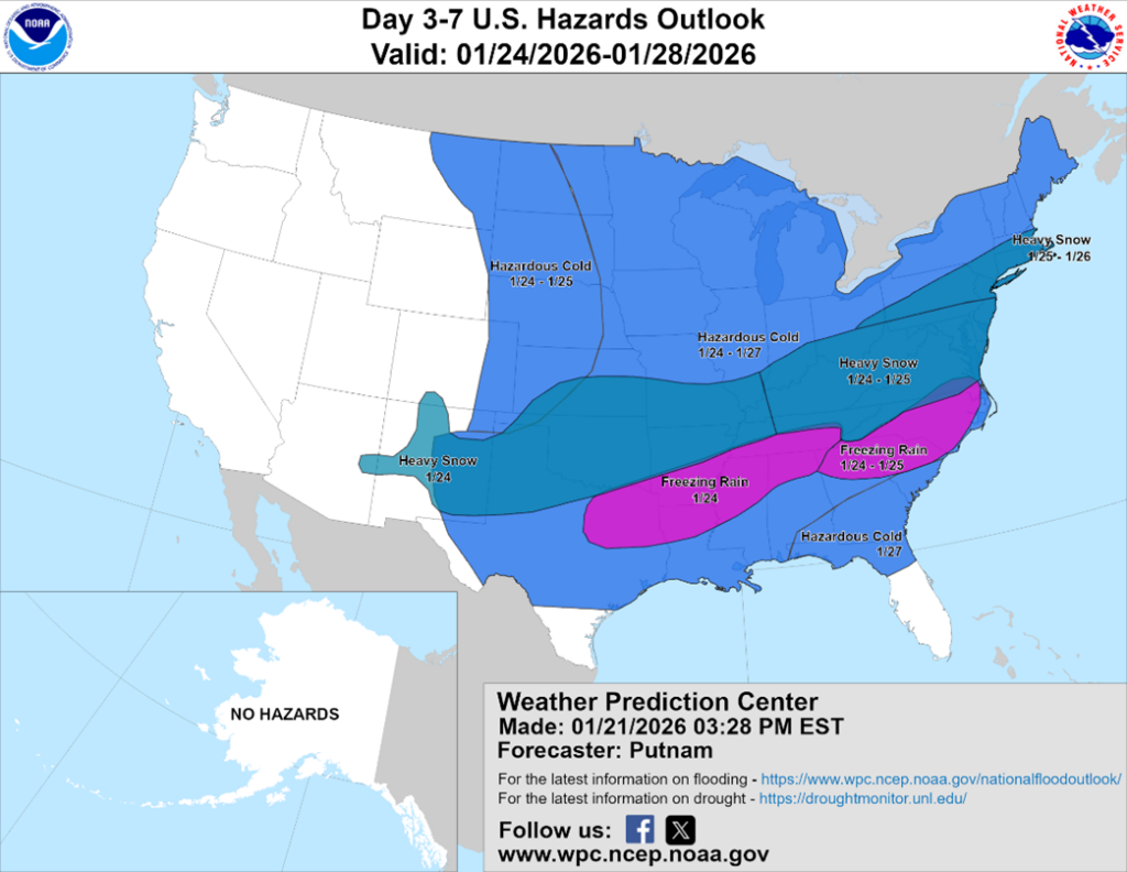 As Winter Storm Fern approaches, forecasts point to significant winter weather impacts across much of the country late this week and into the weekend. Widespread impacts are expected, including potentially damaging ice accumulations from Saturday through Sunday. The Eastern US could see icy roads, delaying fuel deliveries, and potential power outages that disrupt operations.