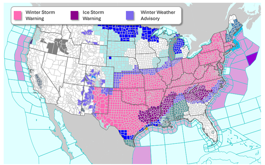 If you’ve lost power and operations are down, or your operations have been recently restored, please contact our operations line: 800-695-6626. Mansfield extends its wishes for safety and warmth to all those in the path of Winter Storm Fern. Winter Storm Fern is in full effect, with freezing temperatures and icy rain moving quickly from Texas into the Southeast. As previous forecasts have indicated, the storm will bring notable freezing temperatures across the US, stretching from Texas and New Mexico all the way up to New England. For fuel markets, this week brought a surge in local demand, with orders nearly doubling in some areas compared to typical seasonal needs. With ice and snow setting in, southern and central US markets are beginning to see a slowdown. Several fuel carriers throughout central Texas and the Southeast have already pulled their trucks off the road due to hazardous road conditions. Other carriers in the Ohio Valley and northeastern US have reported plans to halt operations later this evening. Fuel supply terminals in some markets are also closing as a preventative measure. A small uptick in power outages has been reported in central Texas, but the broader impacts likely won’t be seen until this evening and into Sunday morning.