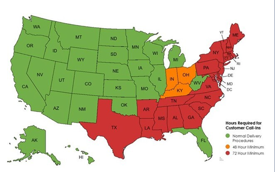Due to active severe weather making deliveries unsafe between today and tomorrow, many markets are effectively closed until conditions warm. Mansfield has moved markets from Texas up to New England to Code Red, requesting 72-hour notice for new deliveries. Mansfield is also moving Indiana, Ohio, and Kentucky to Code Orange, requesting 48-hour notice.