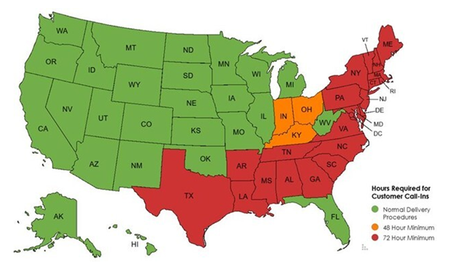 Due to active severe weather making deliveries unsafe between today and tomorrow, many markets are effectively closed until conditions warm. Mansfield remains on Code Red from Texas up to New England, requesting 72-hour notice for new deliveries. Mansfield remains on Code Orange in Indiana, Ohio, and Kentucky, requesting 48-hour notice.