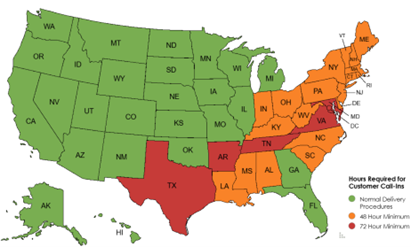 While some markets are beginning to reopen, others are still offline due to road hazards. Even where carriers are beginning to mobilize, delays may occur due to the icy roads and heavy demand. Mansfield deliveries remain on Code Red in Texas, Arkansas, Tennessee, Washington, D.C., Maryland, and Virginia, requiring 72-hour notice for new requests. Mansfield remains on Code Orange in Louisiana, Mississippi, Alabama, South Carolina, North Carolina, Pennsylvania, West Virginia, Indiana, Kentucky, Ohio, Delaware, New Jersey, New York, Connecticut, Massachusetts, Rhode Island, Vermont, New Hampshire, and Maine, requesting a 48-hour notice.