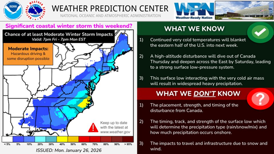 As recovery from Winter Storm Fern continues, attention is turning to another storm system that may be developing late this week. Forecasts indicate that a new East Coast storm could intensify into a nor’easter or bomb cyclone this weekend, with the potential for heavy snow, strong winds, and coastal flooding from the Carolinas to New England.