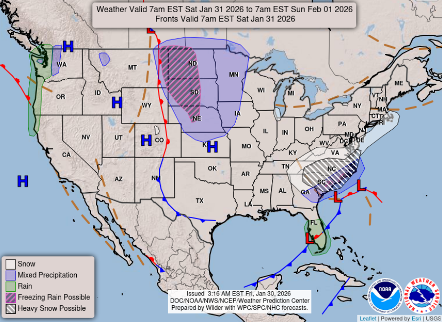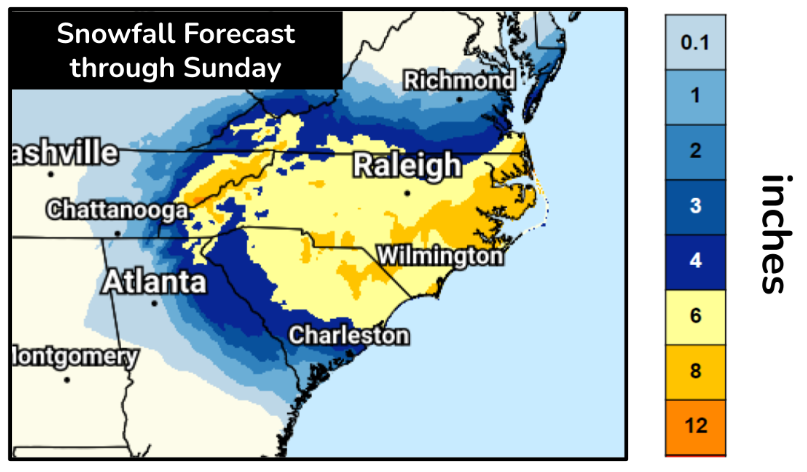 Winter Storm Gianna is set to impact the Southeast beginning tonight and continuing through the weekend. The storm will be centered off the North Carolina coast, bringing widespread snow and strong winds from the southern Appalachians across the Carolinas and into southern Virginia, where some areas face a high risk of receiving more than 8 inches of snow. Sunday is expected to be the most impactful day, with the strong winds, heavier snowfall, and an increased risk of coastal flooding.