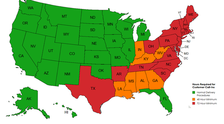 - Code Red (72-hour delivery notice required): Texas, Arkansas, Tennessee, Virginia, Washington D.C., Maryland, North Carolina, South Carolina, Ohio, Pennsylvania, Delaware, New Jersey, New York, Connecticut, Rhode Island, Massachusetts, New Hampshire, Vermont, and Maine.