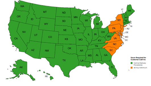 Mansfield remains on Code Orange in South Carolina, North Carolina, Virginia, Maryland, Washington D.C., Delaware, Pennsylvania, New Jersey, and New York, requesting a 48-hour notice for deliveries.