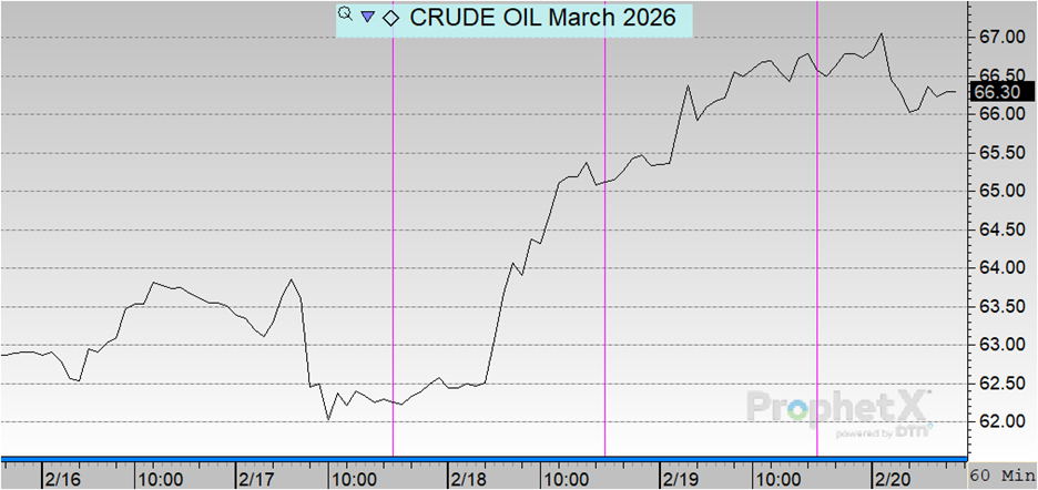 Crude prices climbed roughly 5% week over week, with Brent and WTI trading near six-month highs before easing slightly into Friday, thanks to both geopolitical headlines and active market developments. U.S. energy markets were closed on Monday in observance of Presidents’ Day, concentrating this week’s market movement into fewer days. The rally was largely driven by escalating rhetoric between Washington and Tehran, after President Trump warned Iran it had just 10–15 days to agree to curtail its nuclear program. Iran responded with joint naval exercises alongside Russia and temporary closures tied to military drills near the Strait of Hormuz.