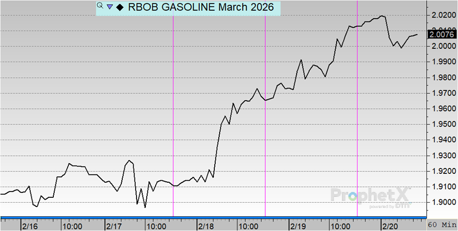 Gasoline opened the week at $1.9110 on Tuesday and held steady on Wednesday at $1.9114. Prices moved higher on Thursday, climbing to $1.9707, before extending those gains into Friday and settling at $2.0080. Overall, gasoline prices increased by $0.0970 over the course of the week, representing a 5.08% gain.