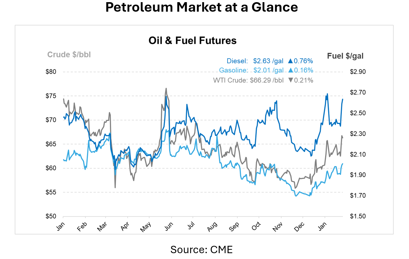 With crude back above $65 and diesel inventories tightening, geopolitical risk premiums are firmly back in play. As tensions around Iran, Russia, and Venezuela evolve, volatility is likely to remain elevated, keeping focus on both near-term supply disruptions and the growing risk of oversupply later in the year.