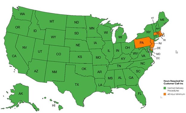 With the area rapidly bounding back following the storm, Mansfield has moved the following states off alert: New York, Maine, Vermont, New Hampshire, and Connecticut. Mansfield remains on Code Orange, requesting a 48-hour delivery notice for new orders, in the following states: Pennsylvania, Delaware, New Jersey, Rhode Island, Massachusetts. Please note that in some areas with lighter storm impacts, deliveries may be possible within a shorter delivery window.