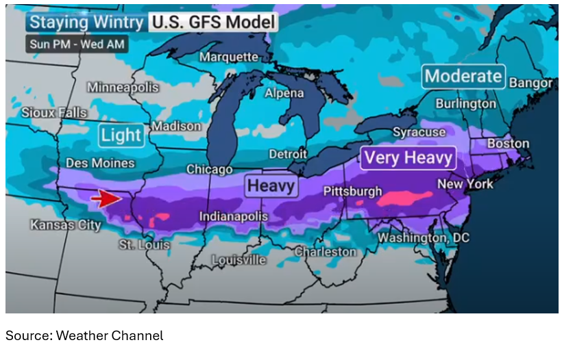 Different models produce conflicting forecasts, with some indicating heavy snowfall from St. Louis to Pennsylvania, while others show a more moderate system overall. Mansfield will continue monitoring the system and will provide updates if there are any material impacts on fuel markets.