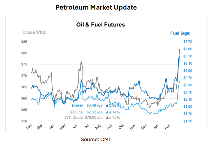 Oil prices continue reacting as tensions intensify across the region. WTI crude futures rose more than $2.40 per barrel Thursday morning and are now roughly $10 per barrel above last Friday’s close, reflecting heightened uncertainty around global petroleum supply flows.