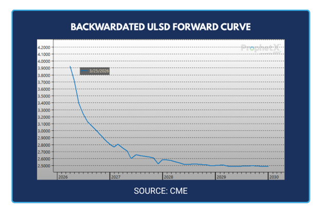 Consider the spread (or difference) between April and December – current diesel future trades in December are $1.50/gal less than current fuel prices. By blending the full 2026 ULSD strip, you can lower your price today by nearly $1/gal and lock in that price for the rest of the year – so even if the market remains above $4-$5/gal all year, you’re locked in below $4.