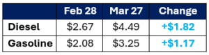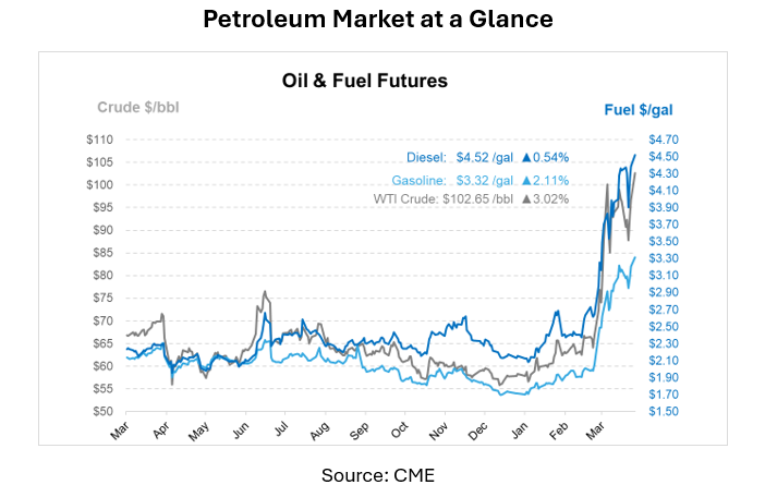 Since the beginning of the US-Israel-Iran conflict, fuel markets have risen significantly. At the Nymex futures level, gasoline is up $1.17 per gallon from Feb, and diesel is up $1.82 per gallon. At gas stations and truck stops across the country, prices are even higher. Economists expect sustained higher prices to reduce demand and economic activity.