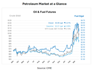 Refined product markets continue to show even tighter conditions than crude. Diesel, in particular, remains under significant pressure globally. The Middle East is a major supplier of diesel and high-yield crude grades, and disruptions there are directly impacting availability. As a result, diesel prices are holding strong and, in many cases, continuing to rise relative to crude. Gasoline is also firm, though less constrained than diesel, as global refining systems adjust to shifting crude flows and product demand.