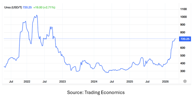 At a global level, urea supply is highly concentrated. The Gulf region accounts for a large share of seaborne exports, and most of that volume typically moves through the Strait of Hormuz. Recent escalations, including force majeure declarations, damage to natural gas infrastructure, and severe shipping constraints, have reduced available supply and made trade flows less reliable. With no strategic reserves to absorb the shock, prices are adjusting quickly and in large increments.
