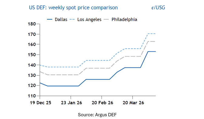 In North America, however, the situation is more nuanced. DEF supply remains stable overall, supported by strong domestic urea production and limited reliance on imports from the Middle East. But that does not mean the market is unaffected. Pricing is still being pulled higher by global dynamics, and recent data shows that domestic DEF values have already moved up meaningfully. According to the latest Argus data, U.S. bulk DEF prices increased by roughly 15–20¢/gallon across major markets in early April.