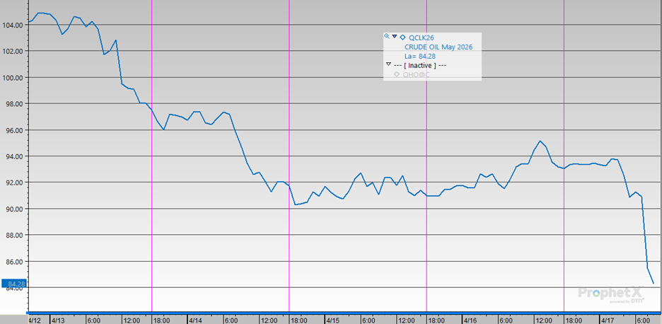 Energy markets are ending the week with a noticeable shift in direction, but the underlying risks tied to the Iran conflict remain. This morning, WTI crude opened down more than $3.50 per barrel and is set to finish the week lower by over $5, as the U.S. and Iran continue negotiations and signal progress toward a deal. President Trump indicated that Iran has agreed to terms it had previously resisted, raising expectations that a broader agreement could be reached soon. At the same time, a parallel 10-day ceasefire between Israel and Hezbollah is helping calm regional tensions. Iran has also stated that the Strait of Hormuz is open during the truce, which immediately pressured crude prices lower – triggering an estimated 9% decline – as markets reacted to the possibility of restored oil flows through one of the world’s most critical shipping lanes.