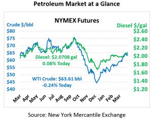 Markets were less than impressed with yesterday’s EIA report despite across-the-board draws for crude, diesel, and gasoline stocks. Crude oil fell back down to the $63/bbl range, with diesel prices following. Yesterday’s losses were less related to the EIA’s report, though, and more tied to equity markets. Today, markets are relatively quiet ahead of a long trading weekend and little news. Crude oil is trading at $63.61, functionally flat with yesterday’s close.
