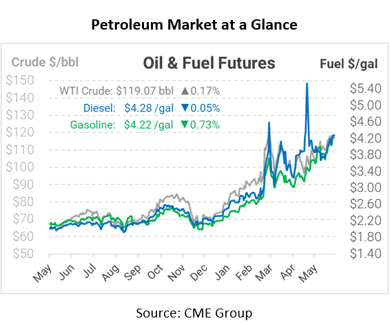 This morning crude prices are slightly up and hovering around the $120/bbl mark after falling following an OPEC+ supply deal. This deal saw Saudi Arabia raise their July prices after continued supply disruptions are still evident due to the Russian conflict in the East.