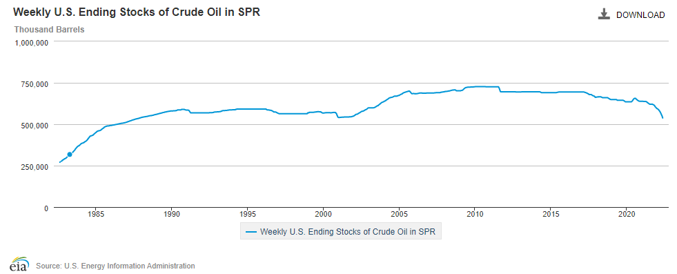 According to the Department of Energy: “The Strategic Petroleum Reserve is a U.S. Government complex of four sites with deep underground storage caverns created in salt domes along the Texas and Louisiana Gulf Coasts.” The reserve cannot be withdrawn all at once – at max capacity, up to 4 million barrels per day can be sold. Although President Biden authorized the release of 1 million barrels per day on March 31, the actual withdraw has been close to 600 thousand barrels per day.