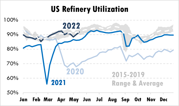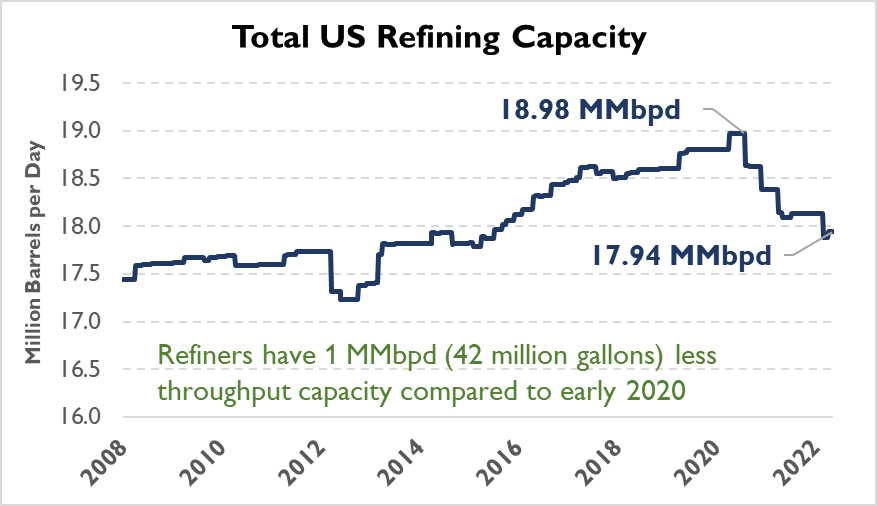 One of the big challenges for fuel supplies is the total amount of refining capacity. Although refinery utilization is high, refiners have 1 MMbpd (42 million gallons) less throughput capacity compared to early 2020. Several refiners shut completely during the pandemic due to reduced fuel demand and poor economics. Others announced planned conversions to producing renewable diesel, though the turnaround time can take months or years.