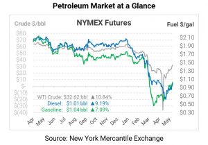 Crude oil is showing strong gains this morning as the market weighs optimistic prospects of rising demand and falling supply. WTI crude is trading at $32.62, a gain of $3.19 (10.8%).