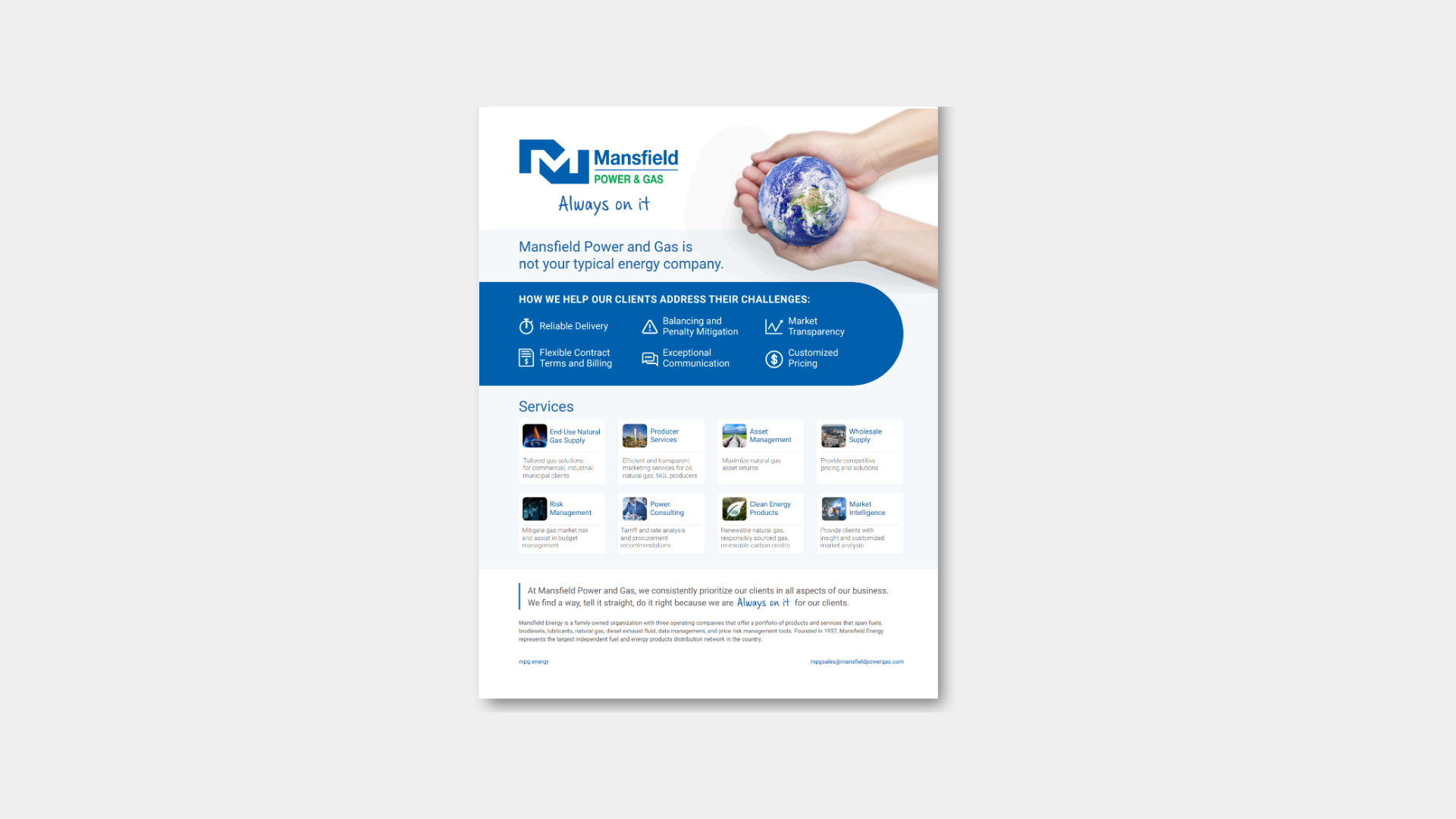 At Mansfield Power & Gas, we consistently prioritize our clients in all aspects of our business. We find a way, tell it straight, do it right because we are Always on It for our clients.